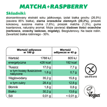 Koncentrat soku jabłkowego, izolat białka grochu (26,9%) (zawiera 85% białka), orzechy ziemne (20,2%), mleko kokosowe w proszku, suszone maliny (1,6%), matcha w proszku (1,3%), guma ksantanowa.