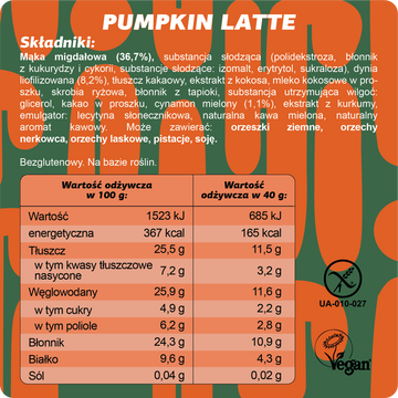 Mąka migdałowa (36,7%), substancja słodząca (polidekstroza, błonnik z kukurydzy i cykorii, substancje słodzące: izomalt, erytrytol, sukraloza), dynia liofilizowana (8,2%), tłuszcz kakaowy, ekstrakt z kokosa, mleko kokosowe w proszku, skrobia ryżowa, błonnik z tapioki, substancja utrzymująca wilgoć: glicerol, kakao w proszku, cynamon mielony (1,1%), ekstrakt z kurkumy, emulgator: lecytyna słonecznikowa, naturalna kawa mielona, naturalny aromat kawowy.