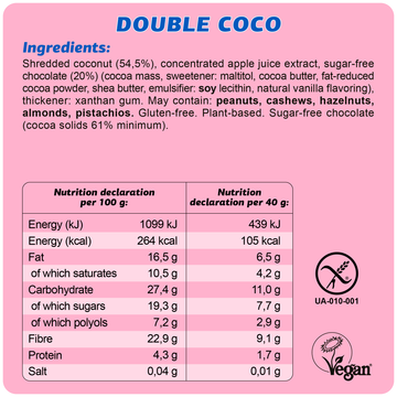 Ingredients: shredded coconut (54,5%), concentrated apple juice extract, sugar-free chocolate (20%) (cocoa mass, sweetener: maltitol, cocoa butter, fat-reduced cocoa powder, shea butter, emulsifier: soy lecithin, natural vanilla flavoring), thickener: xanthan gum. May contain: peanuts, cashews, hazelnuts, almonds, pistachios.