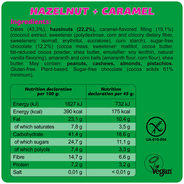 Dates (43,3%), hazelnuts (22,2%), caramel-flavored filling (19,1%) (coconut extract, sweetener (polydextrose, corn and chicory dietary fiber, sweeteners: isomalt, erythritol, sucralose), corn starch), sugar-free chocolate (12,2%) (cocoa mass, sweetener: maltitol, cocoa butter, fat-reduced cocoa powder, shea butter, emulsifier: soy lecithin, natural vanilla flavoring), amaranth and corn balls (amaranth flour, corn flour), shea butter.