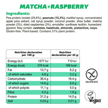 Pea protein isolate (29,6%), peanuts (15,3%), maltitol syrup, concentrated apple juice extract, oat syrup powder, coconut powder, shea butter, matcha powder (3%), dried raspberries (3%), emulsifier: sunflower lecithin, humectant: glycerol.