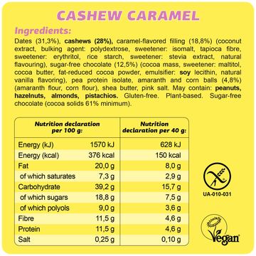 Dates (31,3%), cashews (28%), caramel-flavored filling (18,8%) (coconut extract, bulking agent: polydextrose, sweetener: isomalt, tapioca fibre, sweetener: erythritol, rice starch, sweetener: stevia extract, natural flavouring), sugar-free chocolate (12,5%) (cocoa mass, sweetener: maltitol, cocoa butter, fat-reduced cocoa powder, emulsifier: soy lecithin, natural vanilla flavoring), pea protein isolate, amaranth and corn balls (4,8%) (amaranth flour, corn flour), shea butter, pink salt.