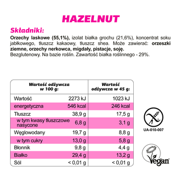 Orzechy laskowe (55,1%), izolat białka grochu (21,6%), koncentrat soku jabłkowego, tłuszcz kakaowy, tłuszcz shea.