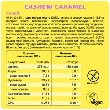 Фініки (31,3%), ядра горіхів кеш`ю (28%), начинка зі смаком карамелі (18,8%) (екстракт кокоса, наповнювач: полідекстроза, підсолоджувач: ізомальт, клітковина тапіоки, підсолоджувач: еритритол, крохмаль рисовий, підсолоджувач: екстракт стевії, натуральний ароматизатор), шоколад без цукру (12,5%) (какао терте, підсолоджувач: мальтитол, какао-масло, какао-порошок зі зниженим вмістом жиру, емульгатор: соєвий лецитин, натуральний ароматизатор ванілі), ізолят протеїну горохового, хрусткі кульки амарантово-кукурудзяні (4,8%) (амарантове борошно, кукурудзяне борошно), масло ши, рожева сіль.
