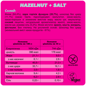 Склад: фініки (64,4%), ядра горіхів фундука (20,7%), шоколад без цукру (11,1%) (какао терте, підсолоджувач: мальтитол, какао-масло, какао-порошок зі зниженим вмістом жиру, масло ши, емульгатор: соєвий лецитин, натуральний ароматизатор ванілі), какао-масло, масло ши, рожева сіль (0,2%). Може містити: арахіс, кеш’ю, мигдаль, фісташки.