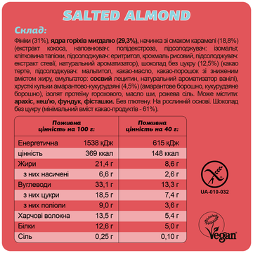 Фініки (31%), ядра горіхів мигдалю (29,3%), начинка зі смаком карамелі (18,8%) (екстракт кокоса, наповнювач: полідекстроза, підсолоджувач: ізомальт, клітковина тапіоки, підсолоджувач: еритритол, крохмаль рисовий, підсолоджувач: екстракт стевії, натуральний ароматизатор), шоколад без цукру (12,5%) (какао терте, підсолоджувач: мальтитол, какао-масло, какао-порошок зі зниженим вмістом жиру, емульгатор: соєвий лецитин, натуральний ароматизатор ванілі), хрусткі кульки амарантово-кукурудзяні (4,5%) (амарантове борошно, кукурудзяне борошно), ізолят протеїну горохового, масло ши, рожева сіль.
