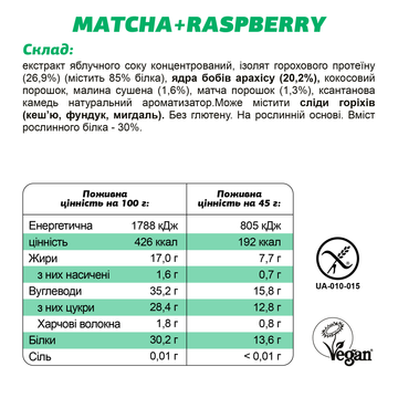Екстракт яблучного соку концентрований, ізолят протеїну горохового (26,9%) (містить 85% білка), ядра бобів арахісу (20,2%), кокосовий порошок, малина сушена (1,6%), матча порошок (1,3%), ксантанова камедь.