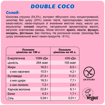 Склад: кокосова стружка (54,5%), екстракт яблучного соку концентрований, шоколад без цукру (20%) (какао терте, підсолоджувач: мальтитол, какао-масло, какао-порошок зі зниженим вмістом жиру, масло ши, емульгатор: соєвий лецитин, натуральний ароматизатор ванілі), загусник: ксантанова камедь. Може містити: арахіс, кеш'ю, фундук, мигдаль, фісташки.
